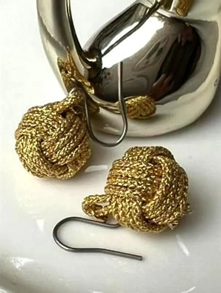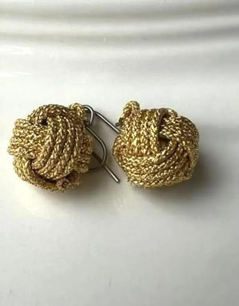 The material is silk, braided with shimmering gold threads that catch the light beautifully, giving the earrings a refined and luxurious appearance.