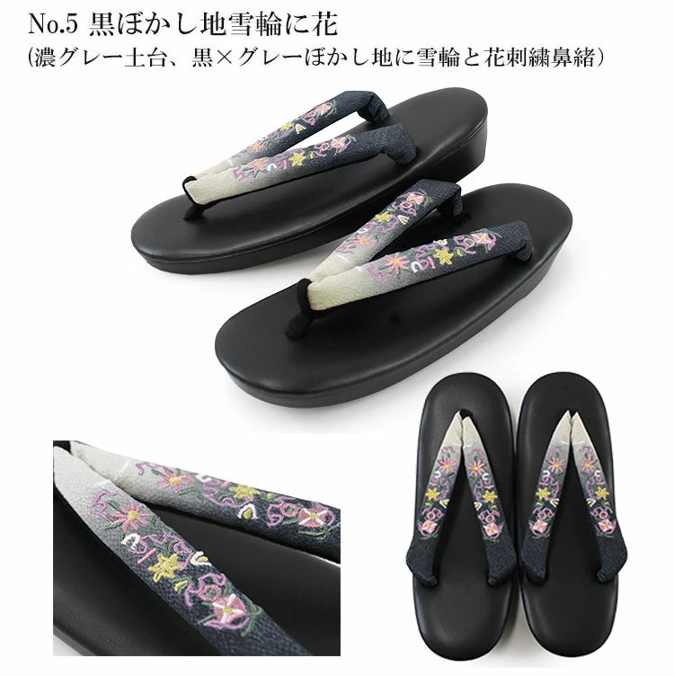 These traditional Japanese zori sandals feature elegantly embroidered floral straps. The hanao (straps) display a smooth gradient from light gray to deep charcoal, beautifully enhancing the delicate pink, yellow, and white floral embroidery. The subtle color shift adds sophistication and makes these sandals suitable for a wide range of kimono styles.