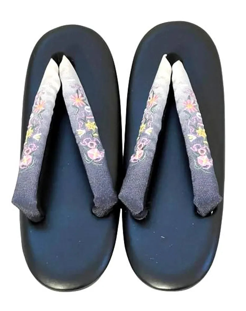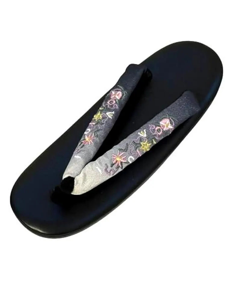Japanese Floral Embroidered Zori Sandals: Dark Gray Traditional Kimono Shoes