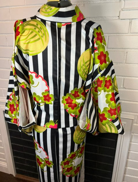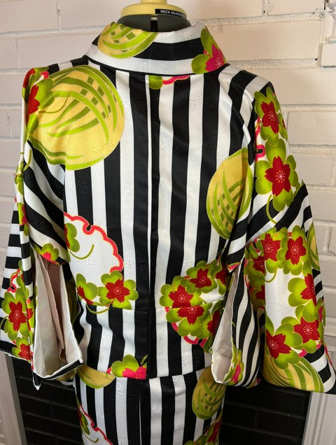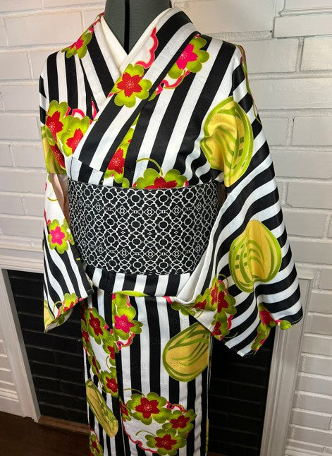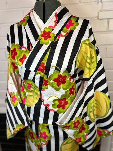 This stunning modern kimono features a bold black and white striped pattern beautifully accented with vibrant red and green plum blossoms. The fresh, contemporary design makes it perfect for both traditional occasions and stylish modern outfits.