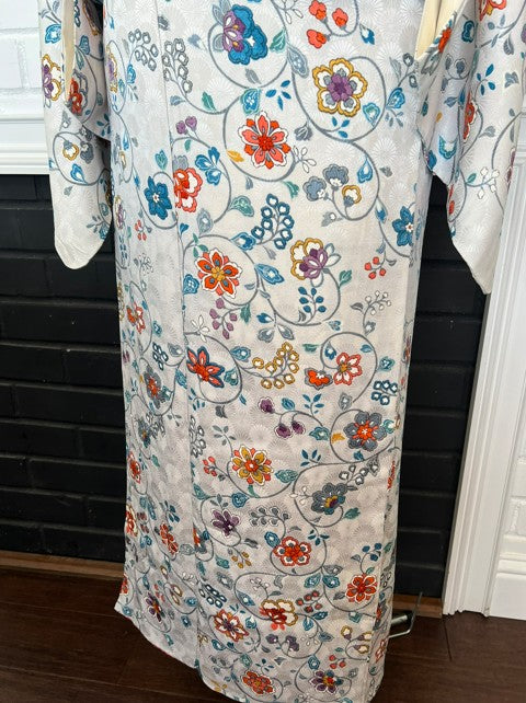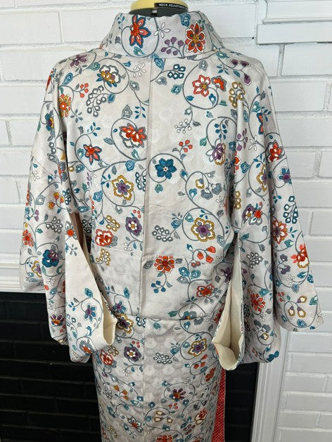 This beautiful vintage awase kimono features a soft white base adorned with delicate, colorful floral patterns. The design combines traditional Japanese elegance with a fresh, modern color palette, making it perfect for both classic and contemporary styling.