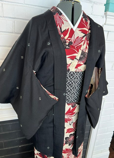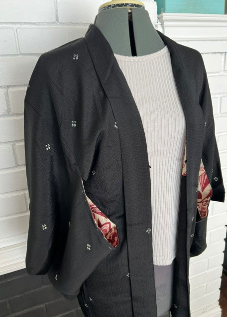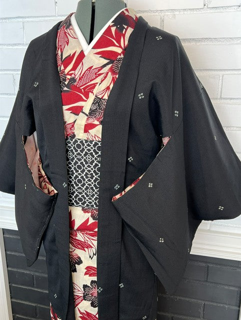 This vintage black haori is a timeless and versatile piece of Japanese kimono fashion.