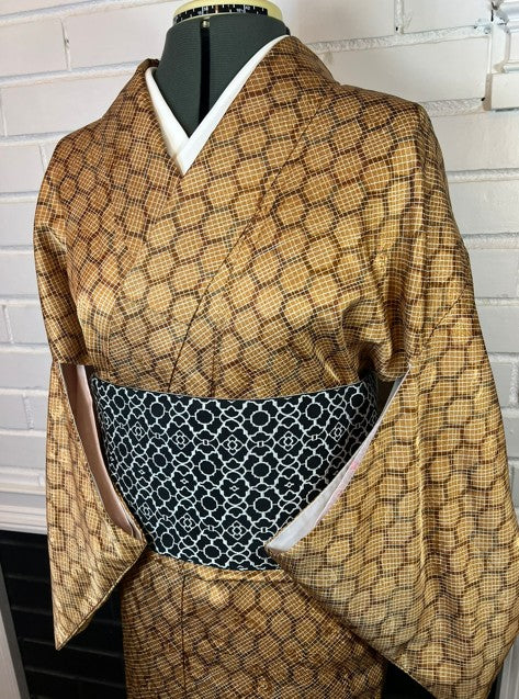 This beautiful awase (lined) kimono features a warm brown base with an intricate geometric grid and circular pattern. Made of durable polyester, it is easy to care for and perfect for both practice wear and casual outings.