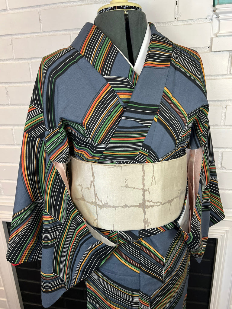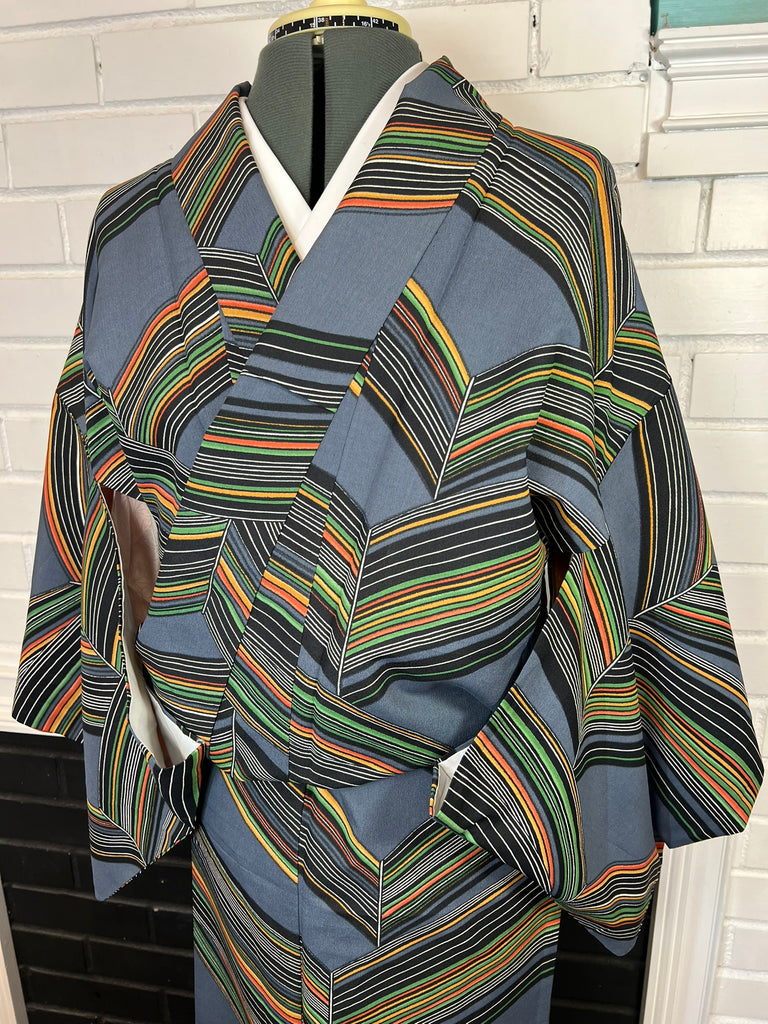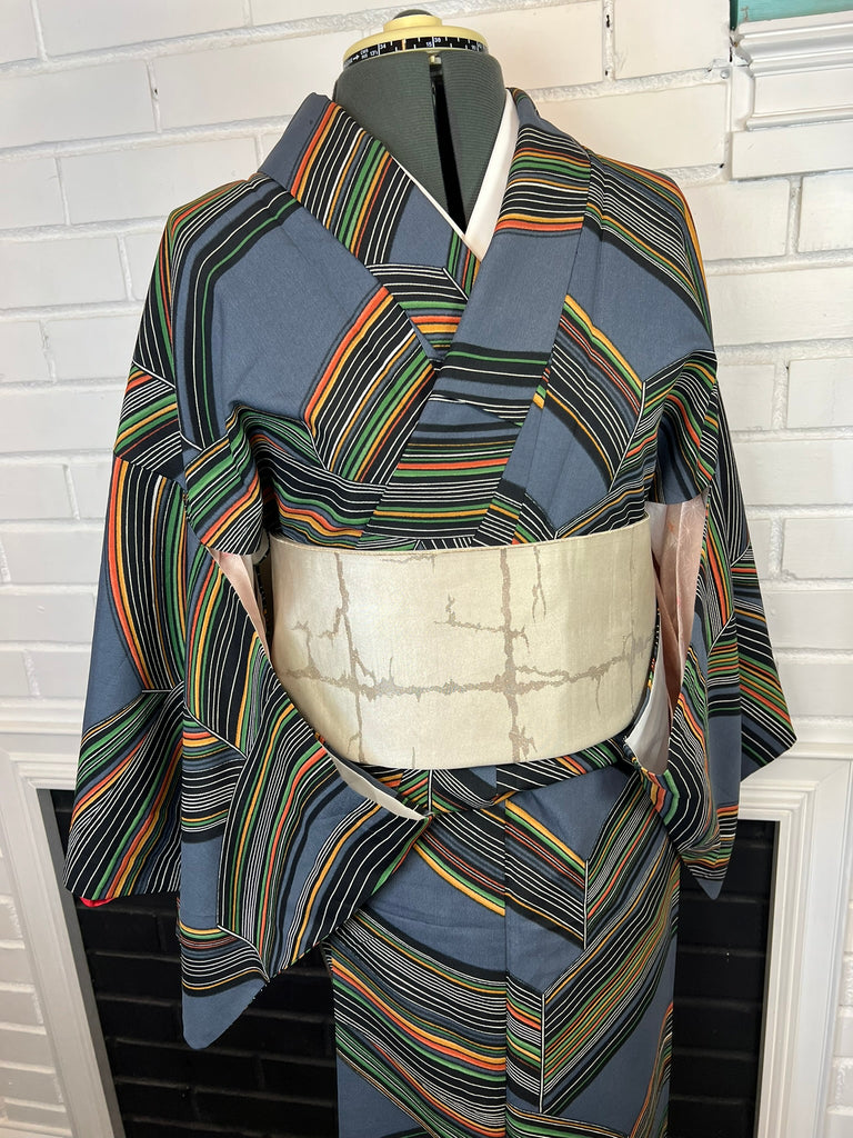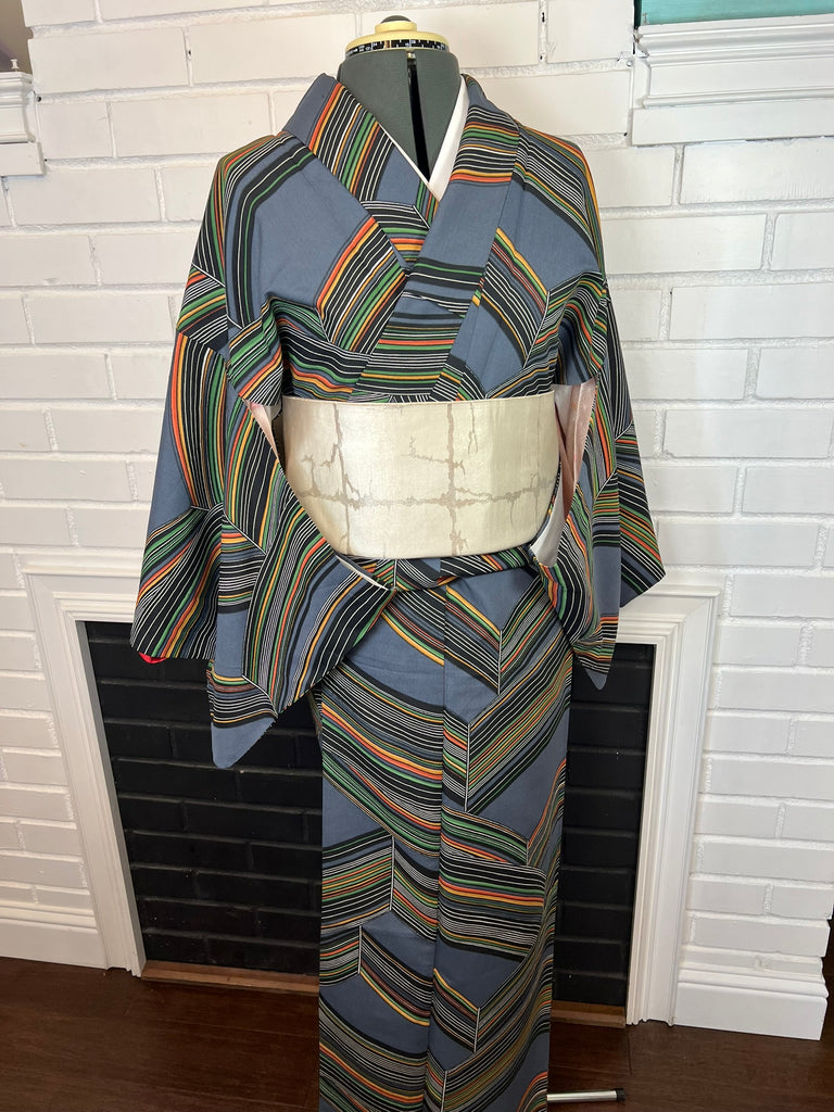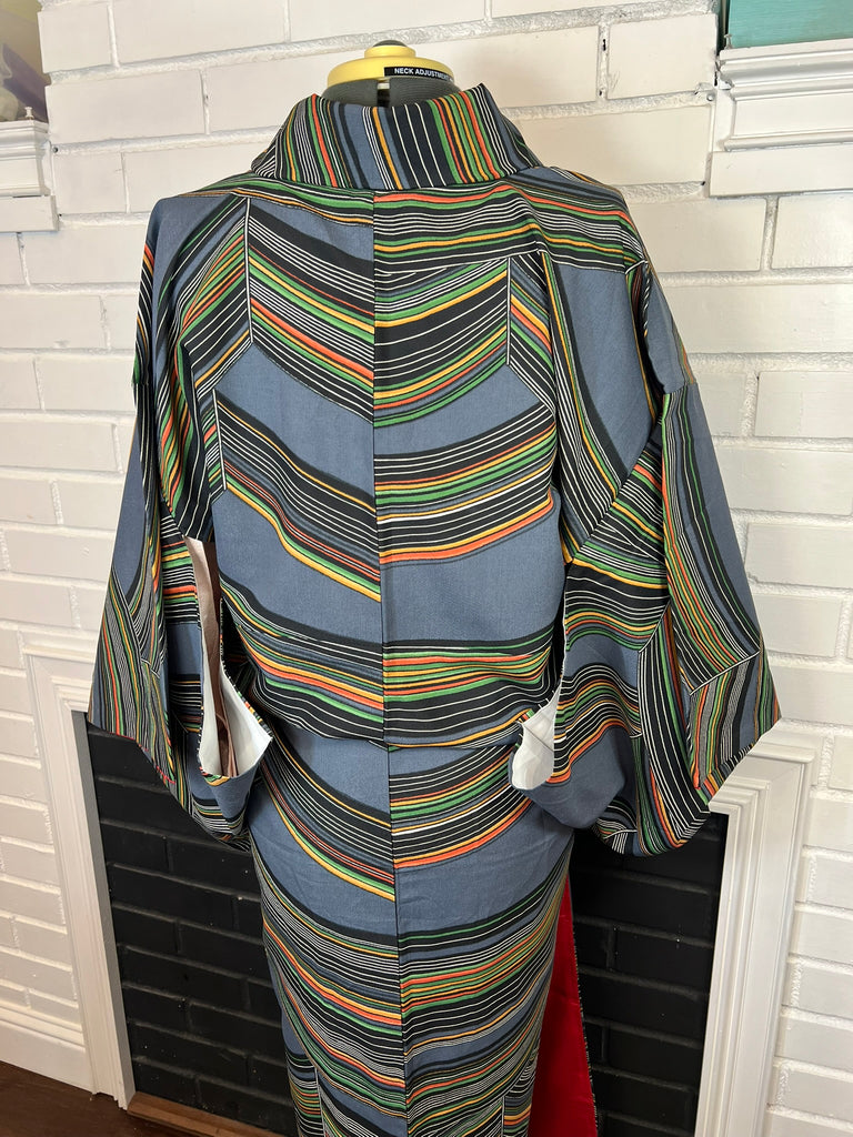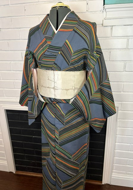 Vintage Japanese Kimono | Blue Gray Striped with Geometric Pattern| Traditional Women’s Awase (Lined) Kimono