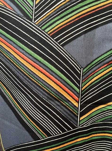 Bring timeless Japanese elegance into your wardrobe with this vintage women’s kimono, featuring a striking blue base adorned with bold multicolored stripes in shades of green, orange, yellow, and black. The dynamic geometric stripe pattern creates a modern yet traditional look, making this kimono a versatile piece that celebrates both history and style.
