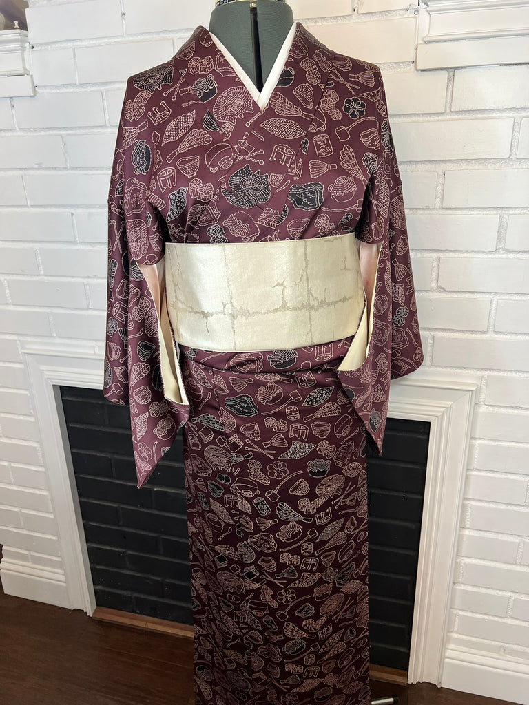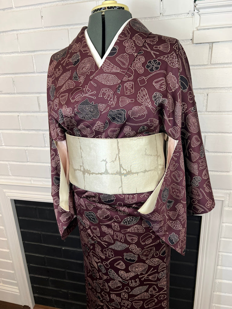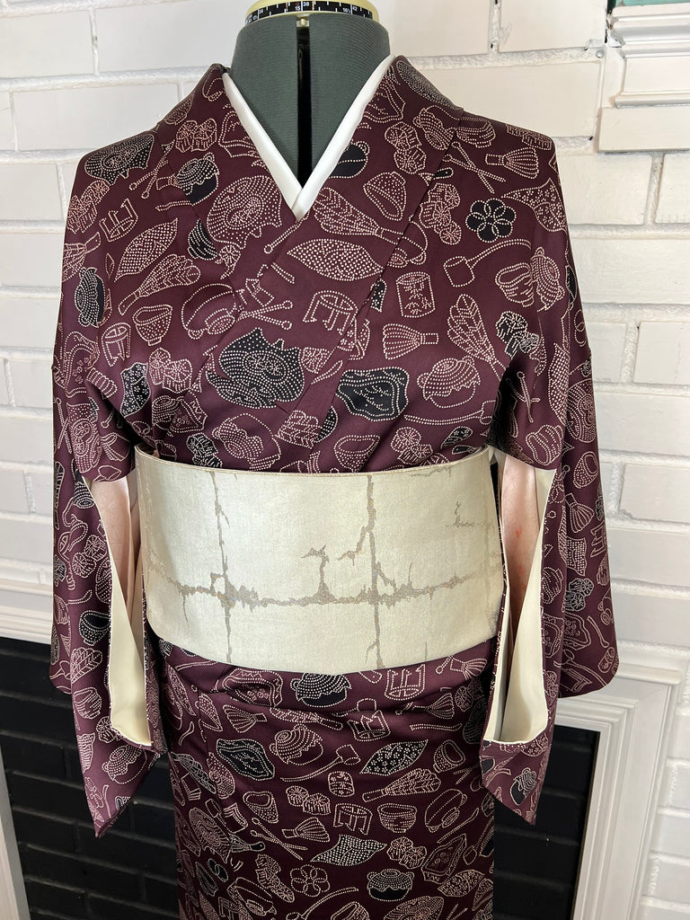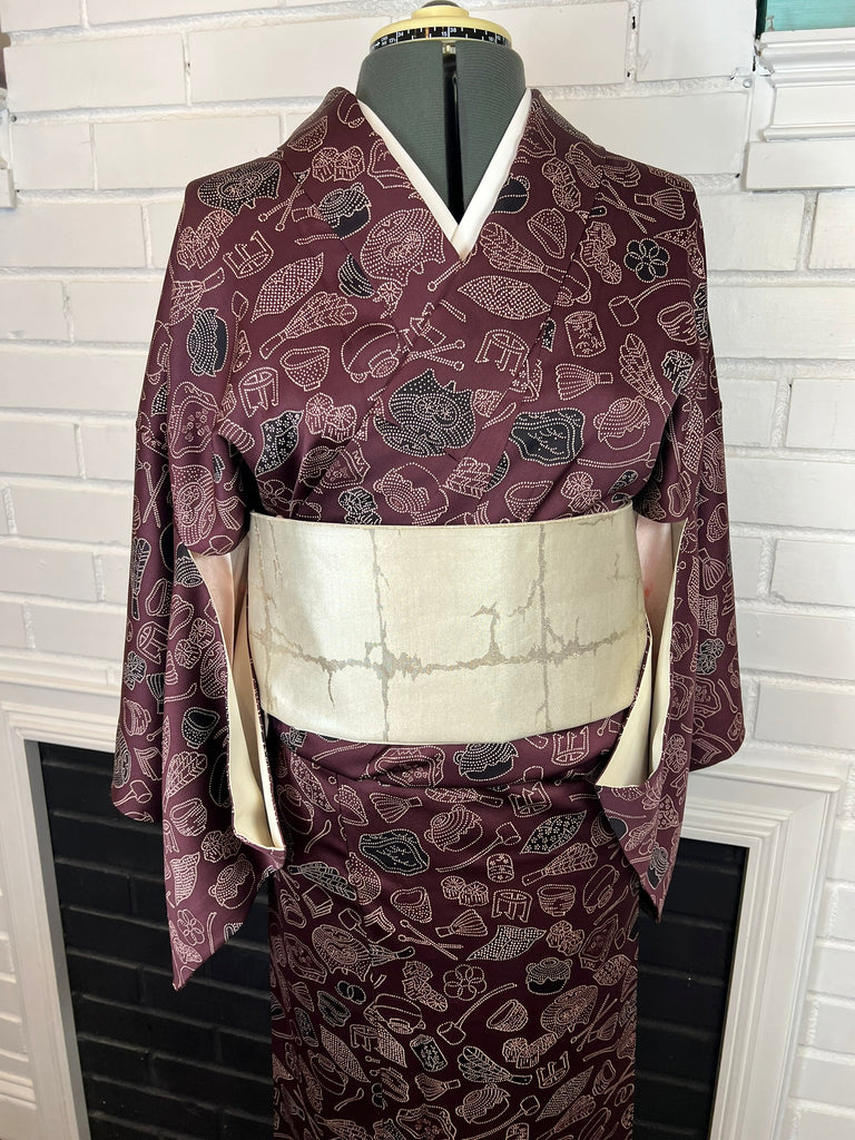 Bring timeless Japanese elegance into your wardrobe with this vintage awase (lined) kimono, crafted in a rich burgundy tone and decorated with delicate dotted motifs. Each design element reflects the artistry and charm of traditional Japanese culture, featuring tea ceremony utensils, nature-inspired patterns, and classic symbols. This piece beautifully blends sophistication with cultural heritage, making it suitable not only for wearing but also for display as a collectible item.