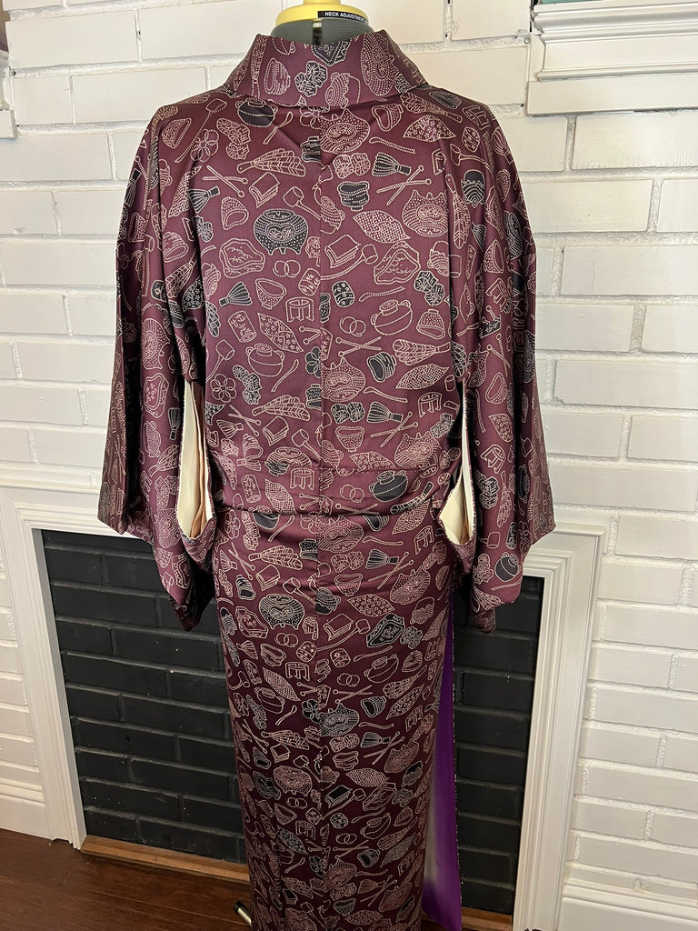 Vintage Japanese Kimono | Burgundy Awase with Tea Ceremony & Nature Motif – Authentic Traditional Wear