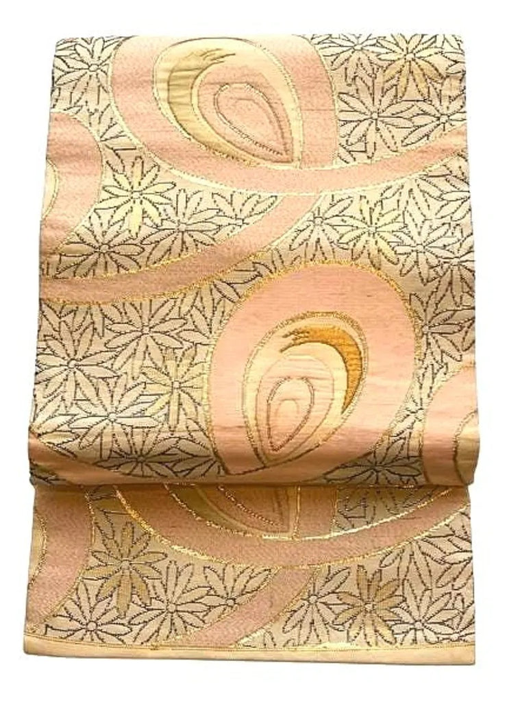 Beautiful vintage Japanese Nagoya obi featuring an elegant blush pink and champagne gold color palette with shimmering woven details.