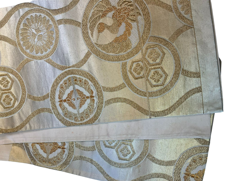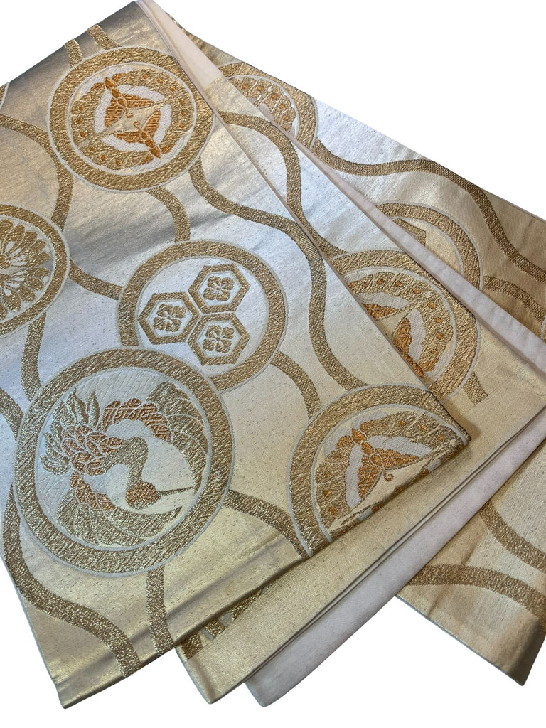 Vintage Japanese Silk Fukuro Obi – Gold and Silver Woven Cranes & Family Crests Pattern