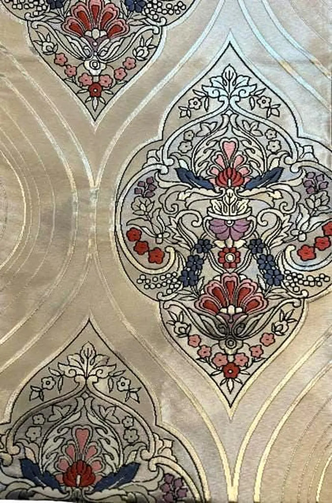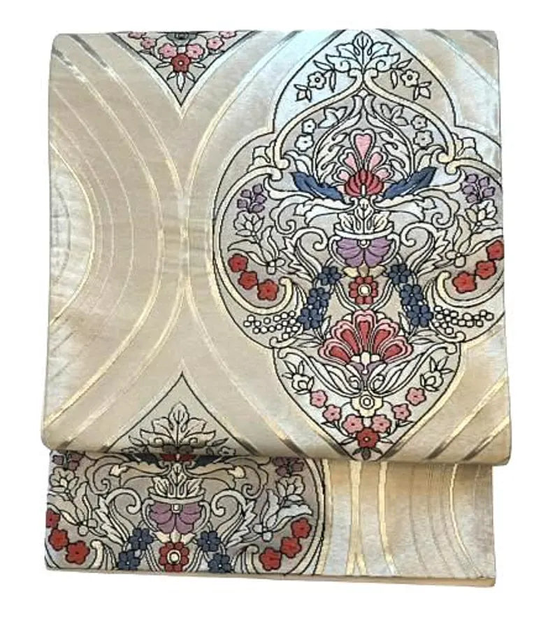 This is a vintage Japanese silk Fukuro Obi, beautifully woven with an elegant floral arabesque motif in shades of red, purple, and blue on a soft silver background. The shimmering gold threads highlight the intricate design, creating a luxurious and timeless piece of traditional Japanese textile art.