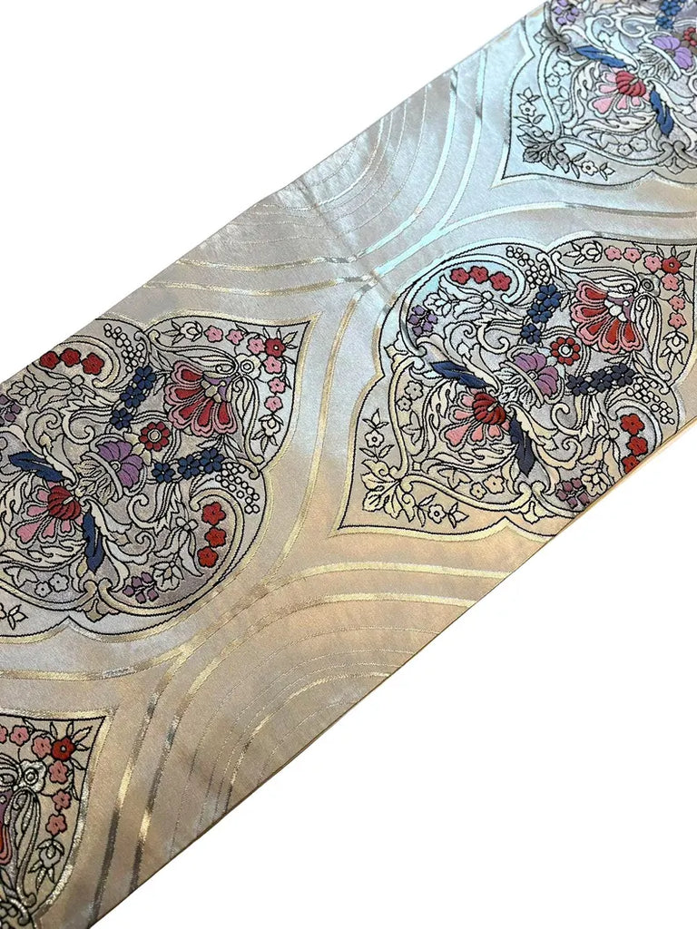 Vintage Japanese Silk Fukuro Obi – Silver Brocade with Floral Arabesque Pattern | Kimono Belt