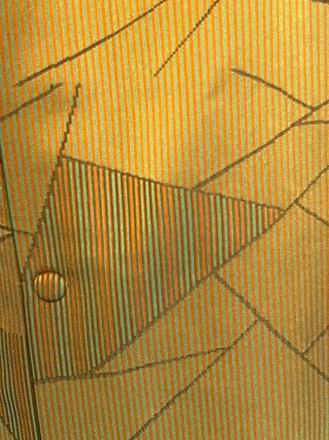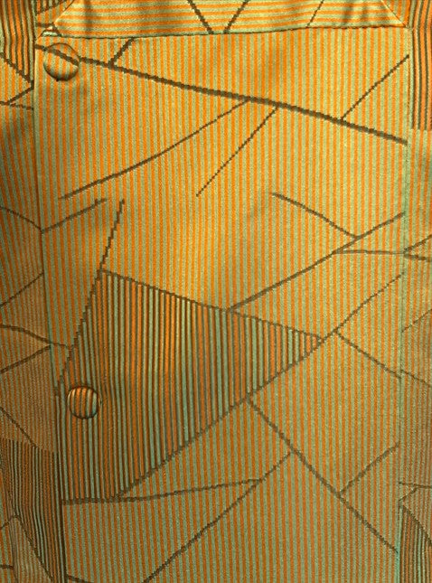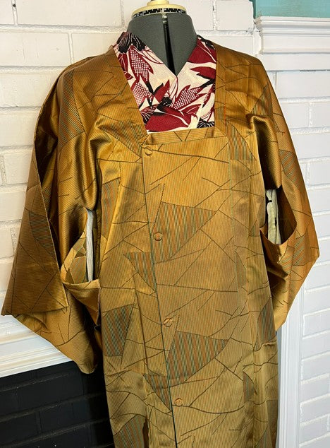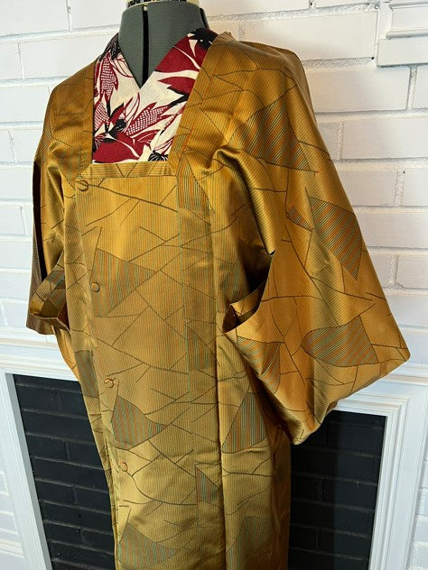 This vintage long silk michiyuki coat features a striking golden mustard tone with an elegant geometric pattern, blending traditional Japanese craftsmanship with a refined, modern aesthetic.