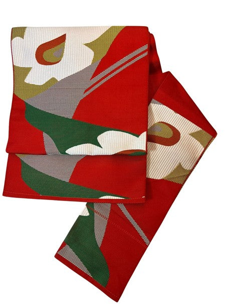 Vintage Nagoya Obi with Bold Red and White Floral Design – Japanese Kimono Belt