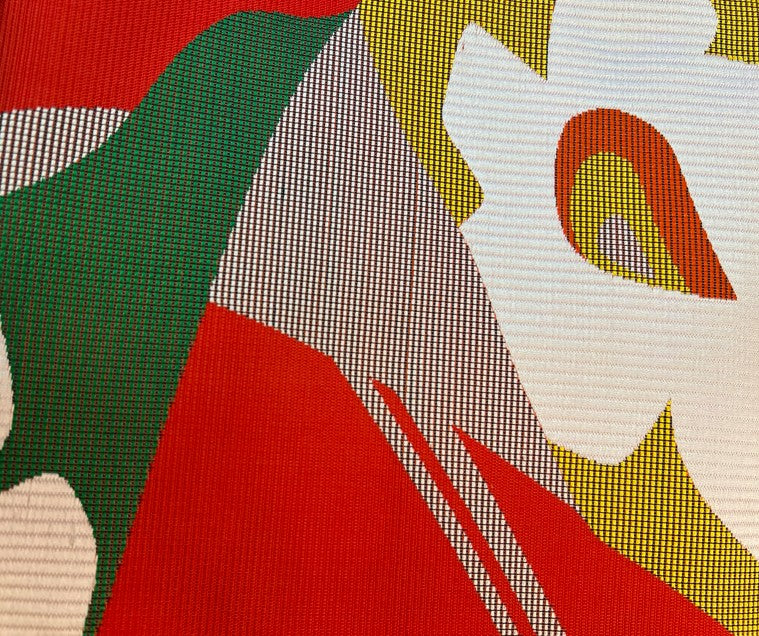 The large, modern-style flowers give it a vibrant and artistic look, making it a perfect accent piece for both traditional kimono coordination and creative styling such as interior display or fashion design projects.