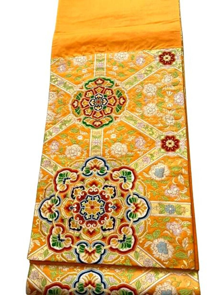 This beautiful vintage fukuro obi is crafted from 100% silk and features an elegant golden base richly woven with colorful floral medallions. The intricate brocade design includes shades of red, green, blue, orange, and ivory, creating a luxurious and traditional look.