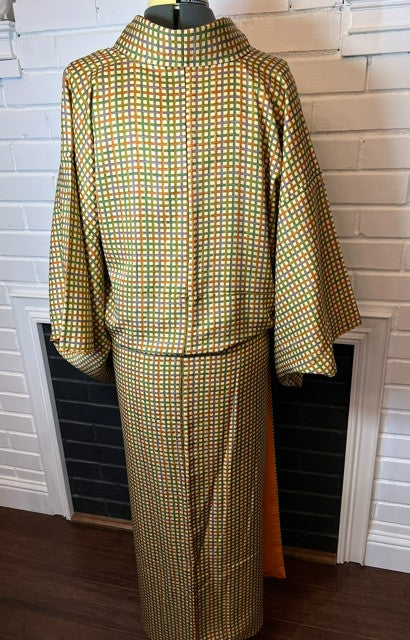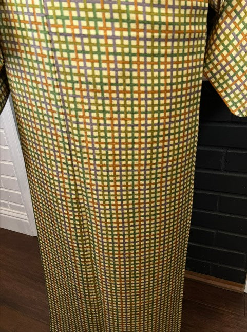 The kimono showcases an intricate lattice design in shades of olive green, mustard yellow, brown, and soft lavender. The combination of warm and muted tones gives it a sophisticated, retro feel that reflects classic Japanese aesthetics.