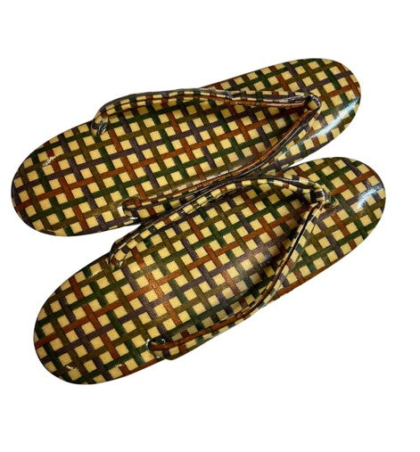 The matching zori sandals feature a similar geometric motif that pairs beautifully with the kimono, creating a cohesive and stylish set.