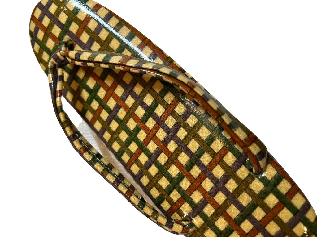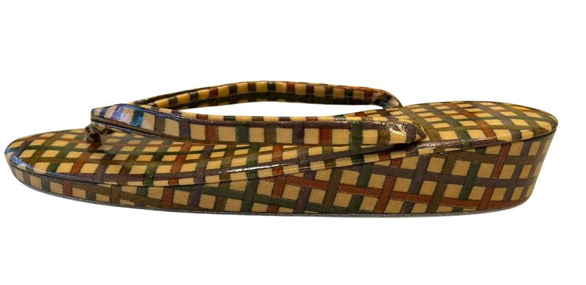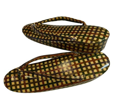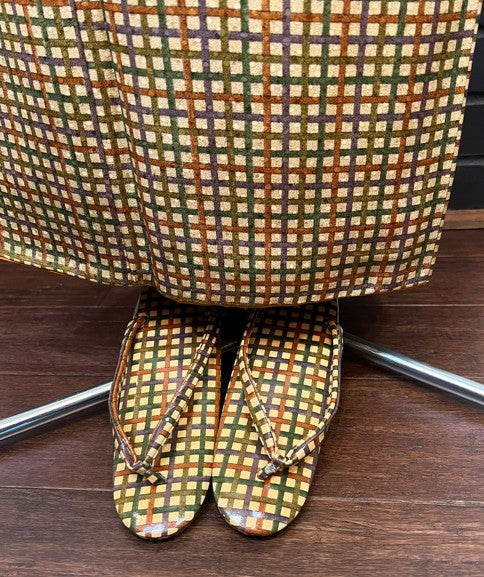 This elegant vintage kimono and zori sandal set features a stunning geometric woven pattern in rich autumn-inspired colors.