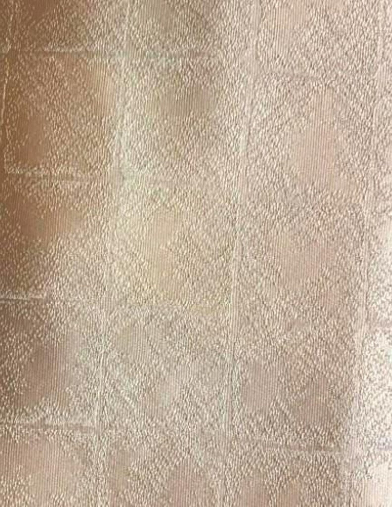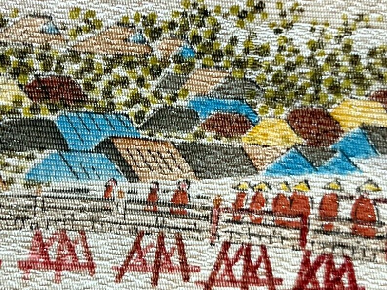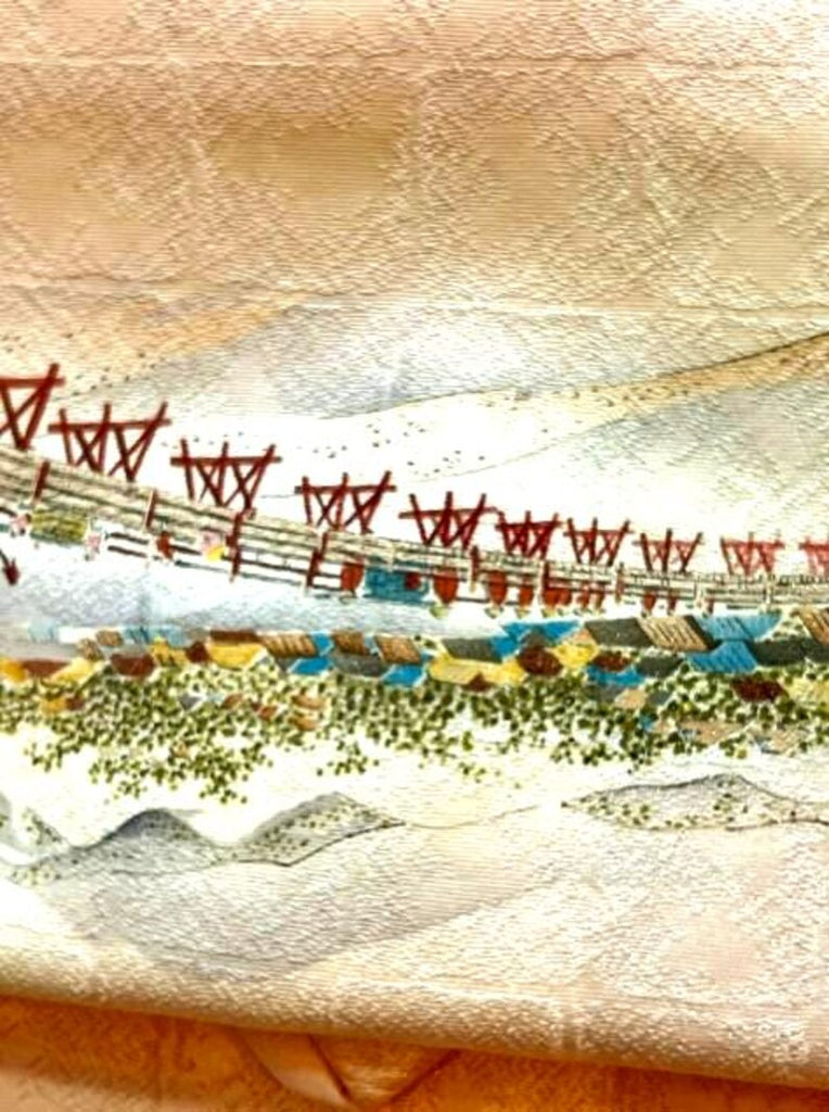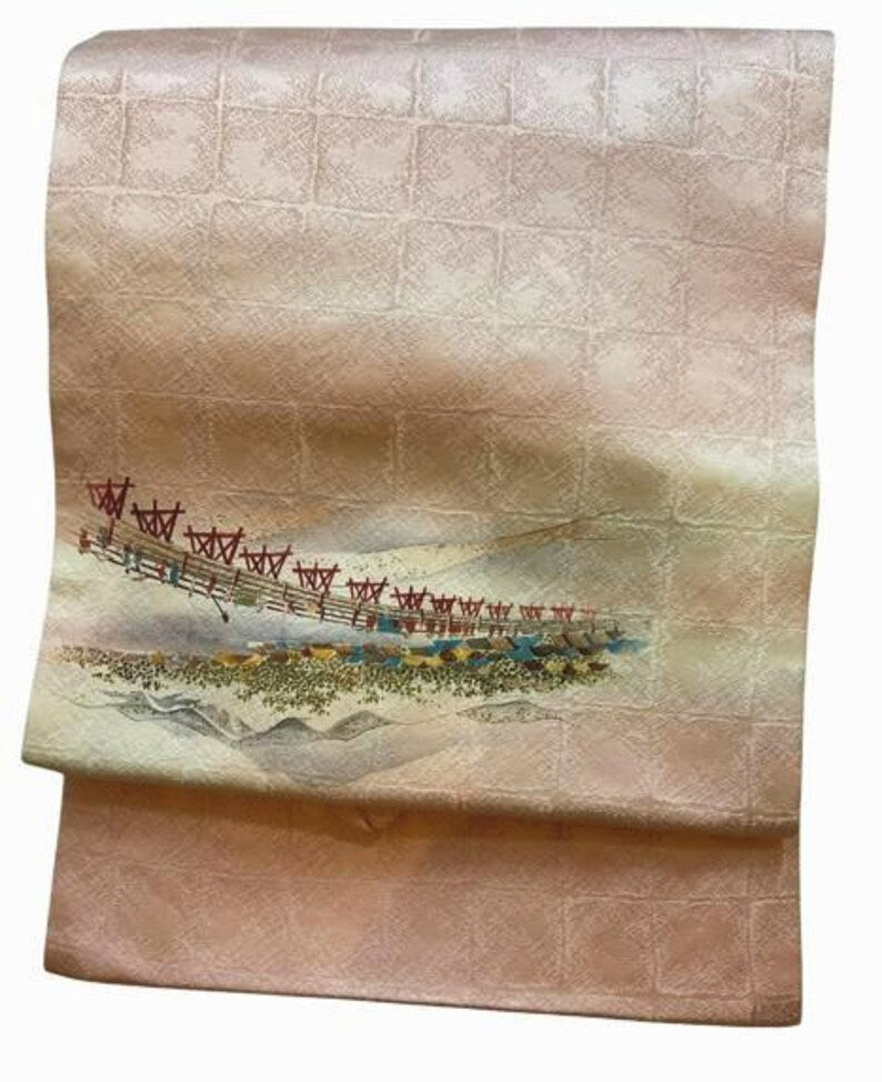 This beautiful vintage silk Nagoya obi features a soft, pale pink base with an elegant woven pattern and a detailed scenic embroidery.